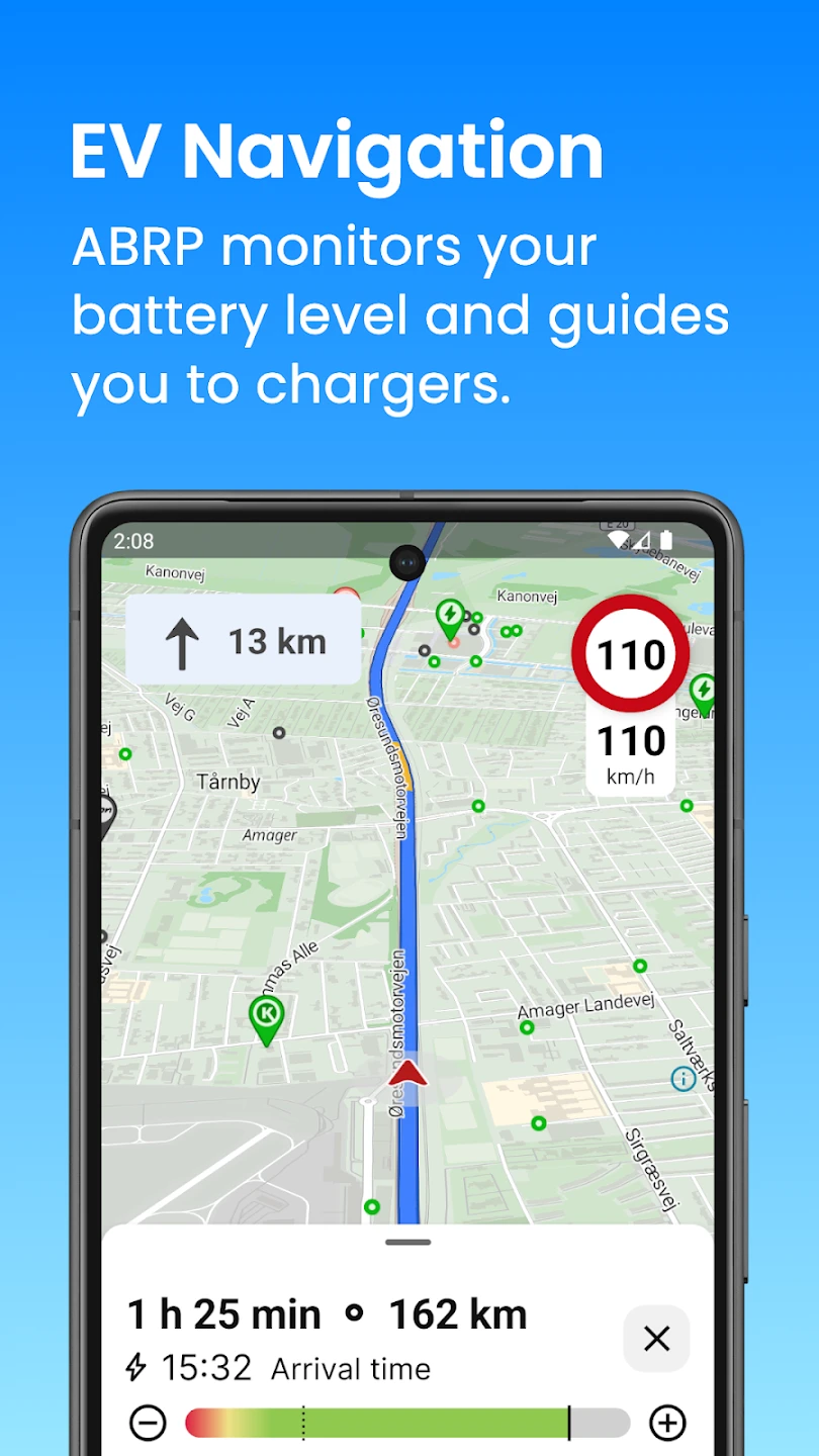 - Comprehensive Charging Infrastructure Integration: ABRP pulls data on a vast network of charging stations globally, displaying locations, connector types (AC/DC, CHAdeMO, CCS, etc.), charging power availability, and user reviews. This helps users identify and navigate towards suitable charging points based on time constraints or preferred amenities, minimizing search time during long journeys.