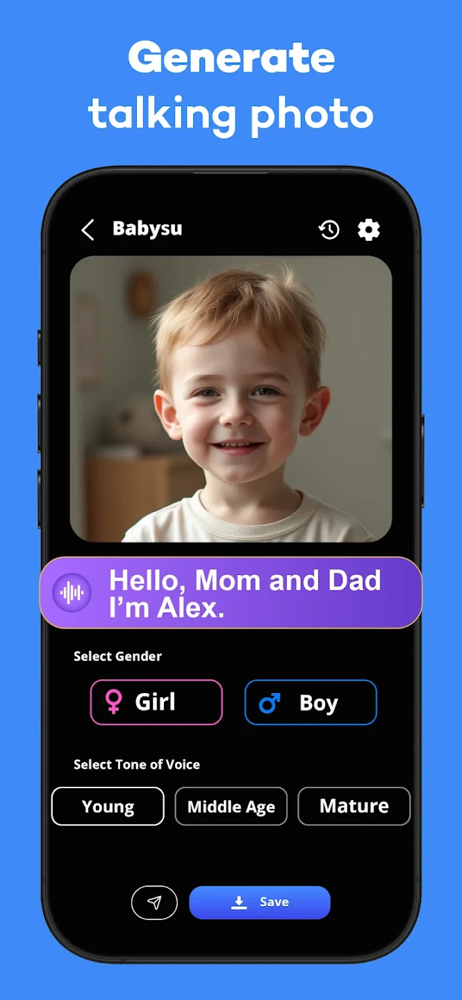 • Fun Animation Mode: Animate your baby avatars with subtle movements, enhancing the experience for users who want to see their digital creation “come alive” before sending it.