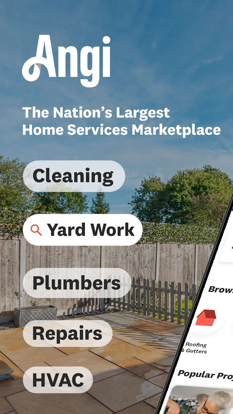 A: The Angi app connects users with pros for plumbing, electrical, HVAC, roofing, painting, landscaping, and many other home services, with specialized options for senior care and handyman tasks as well.