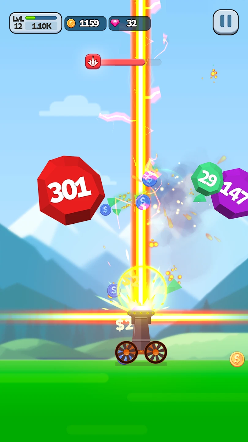- Step 3: Your score increases with each object destroyed. Tap the “Upgrade” button to buy new ball types or aim modes. Complete levels within the time limit to score higher and unlock new game modes.