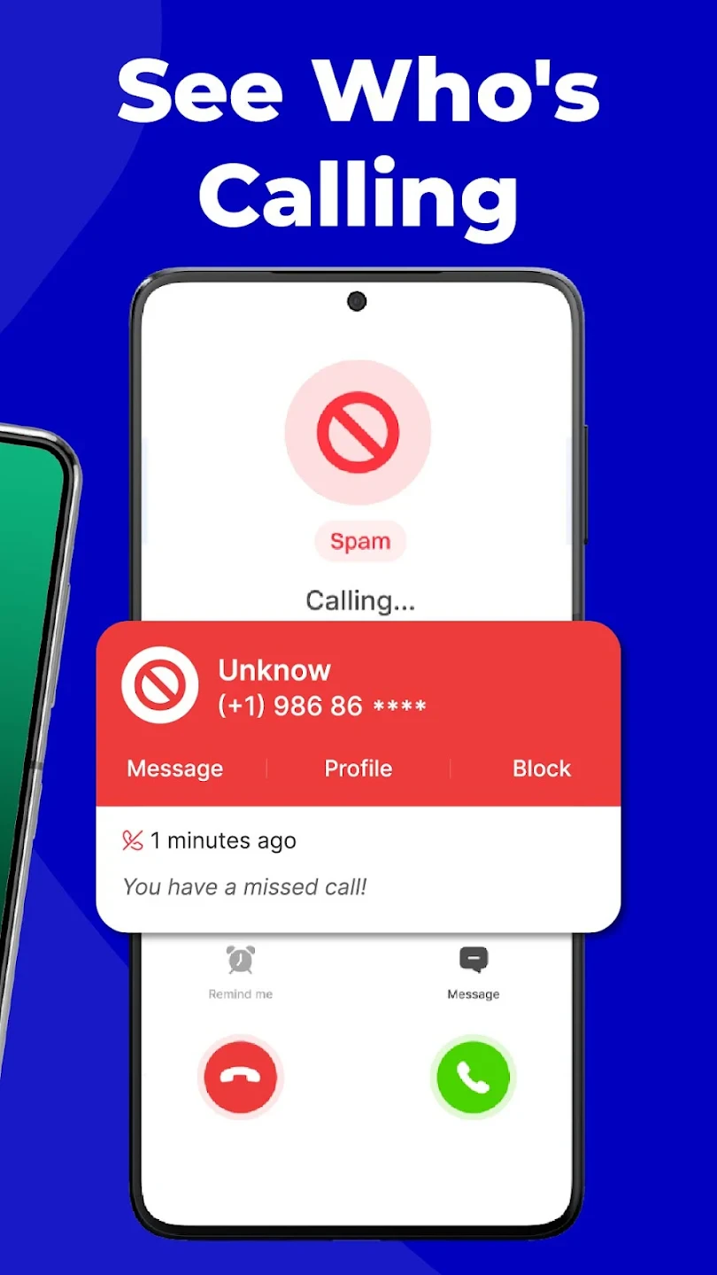 - Detailed Call Information Display: Instantly see the caller’s name and number (if available via cellular provider or contacts), along with a clear indicator whether the call is marked as ‘Spam’, ‘Scam’, or potentially ‘Legitimate’. This immediate feedback helps users decide whether to answer or let the call go to voicemail without hesitation.
