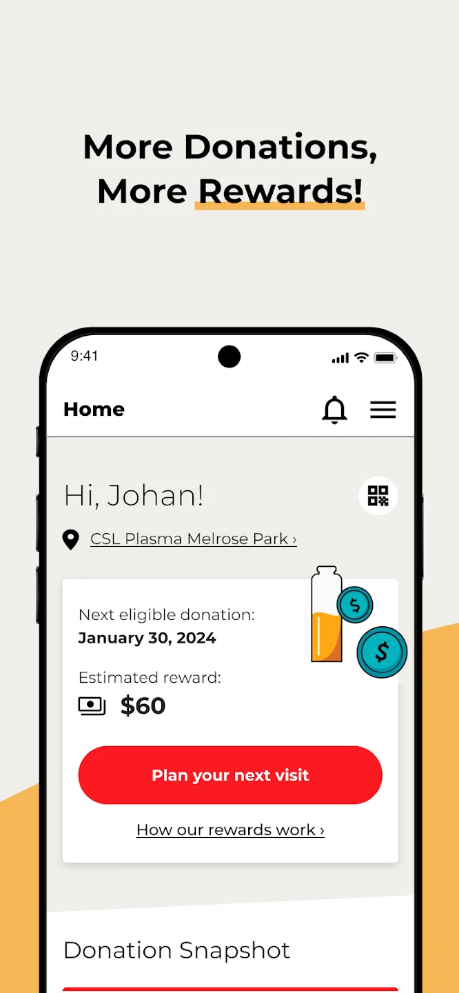 - Donor Information & Check-In: The CSL Plasma app allows staff to quickly access, update, and verify donor details at the point of collection, including eligibility checks and medical screening results. This speeds up the initial stages of the donation process, minimizing wait times and ensuring compliance before starting the collection, which is essential for maximizing collection efficiency.