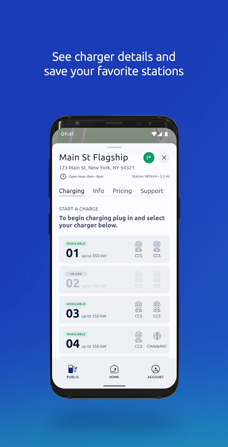 • Finding Nearby Stations: Instantly discover available charging stations on the map or by search criteria like zip code or destination. This feature saves drivers significant time by identifying closest operational chargers, reducing the guesswork involved in planning long trips or finding a spot unexpectedly.