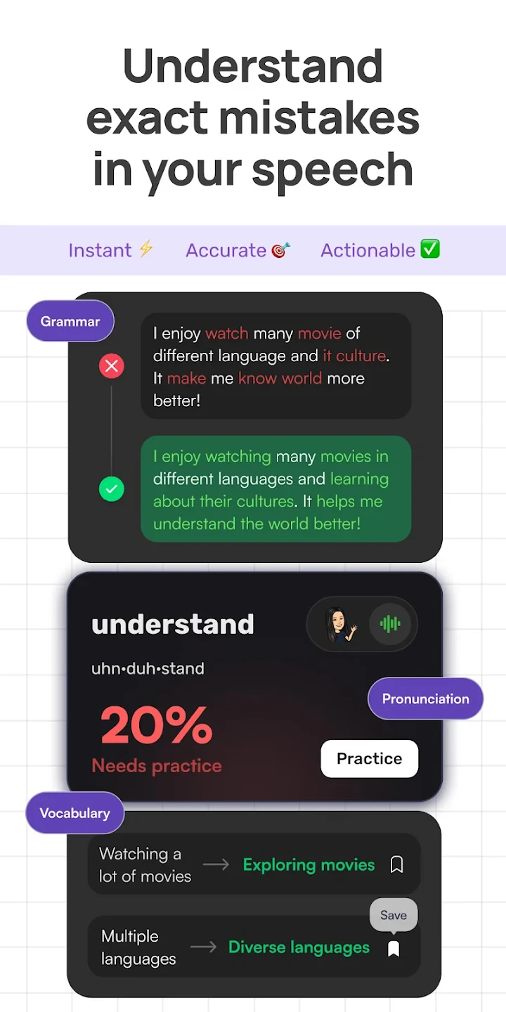 Designated for offline progress and real-time transcription/feedback provision. Known for its emphasis on standard accent alignment.