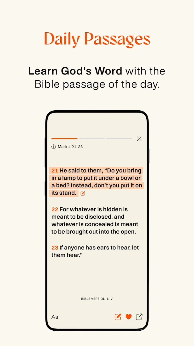 - Bible Study Tools: Seamlessly access key Bible verses relevant to the devotional readings, with options to bookmark favorite verses for easy reference in future. The integration allows for deeper scripture study directly within the app, featuring a simple search function and clear highlighting of verse numbers for focused reading.
