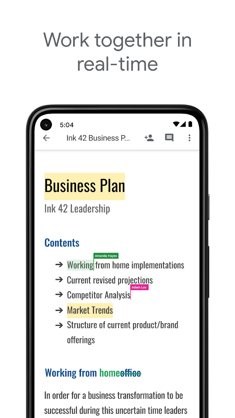 - Cloud Storage Integration: Documents are automatically saved in **Google Drive**, providing substantial cloud storage space. This means no more saving files locally, worrying about hardware failure, or running out of device storage. It allows for version history tracking, enabling users to restore previous states if they make a significant error, offering flexibility and peace of mind.