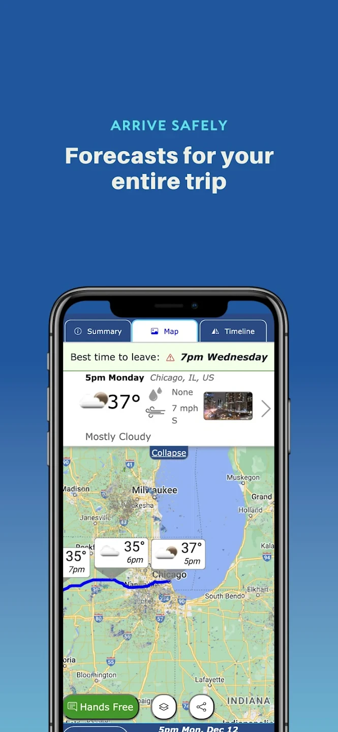 Extensive travel planning app with robust weather integration for destinations. Provides detailed arrival/departure forecasts but focuses broadly beyond just highway conditions. |