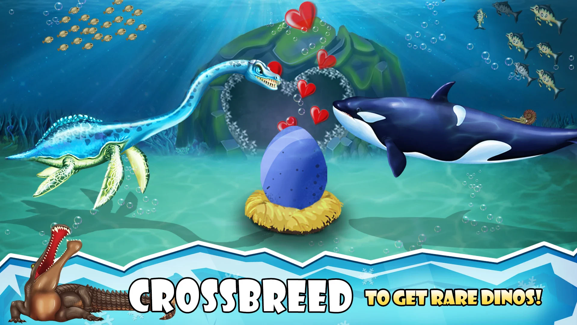 • Visuals or Art Style: The game features bright, cartoonish graphics with smooth animations. Underwater environments are depicted with vibrant colors and coral backgrounds, contrasting with the slightly more menacing dinosaur visuals. Descriptive adjectives like ‘glistening’ and ‘vibrant’ perfectly capture its visually engaging style.