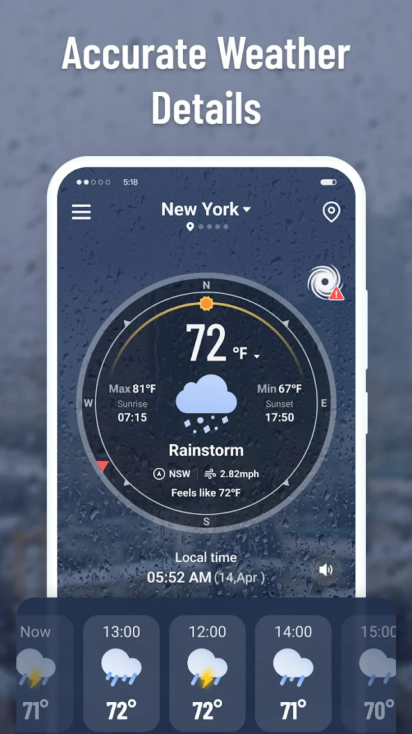 - Severe Weather Alerts: Receives immediate notifications for approaching severe weather like thunderstorms, tornadoes, or flash floods. This feature uses official meteorological data to ensure warnings are both timely and accurate, enhancing user safety.