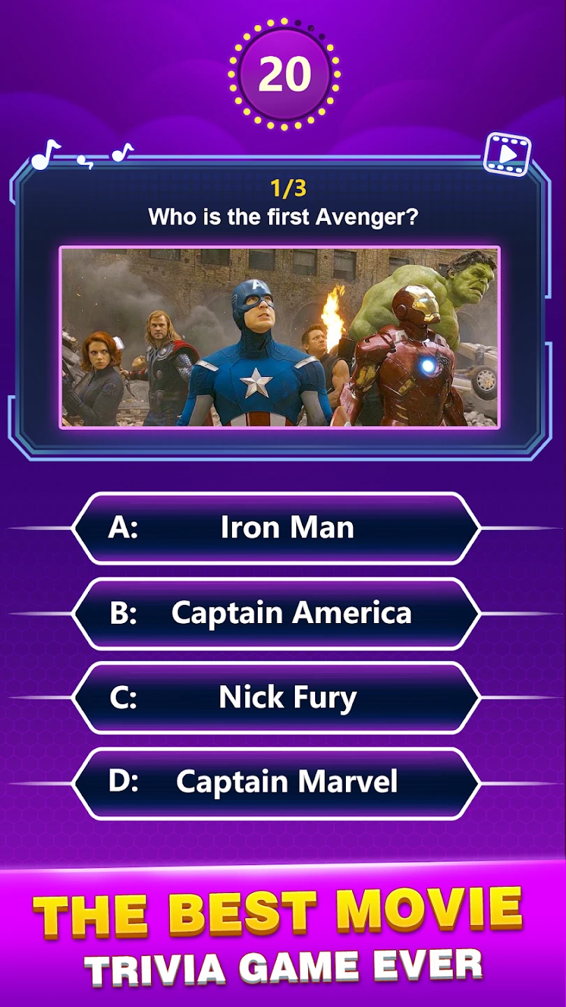 - [Core Gameplay Loop]: Players answer movie-related questions presented as multiple-choice options. Each correct answer earns points, while incorrect choices penalize the score, adding a competitive element to test both knowledge and speed.