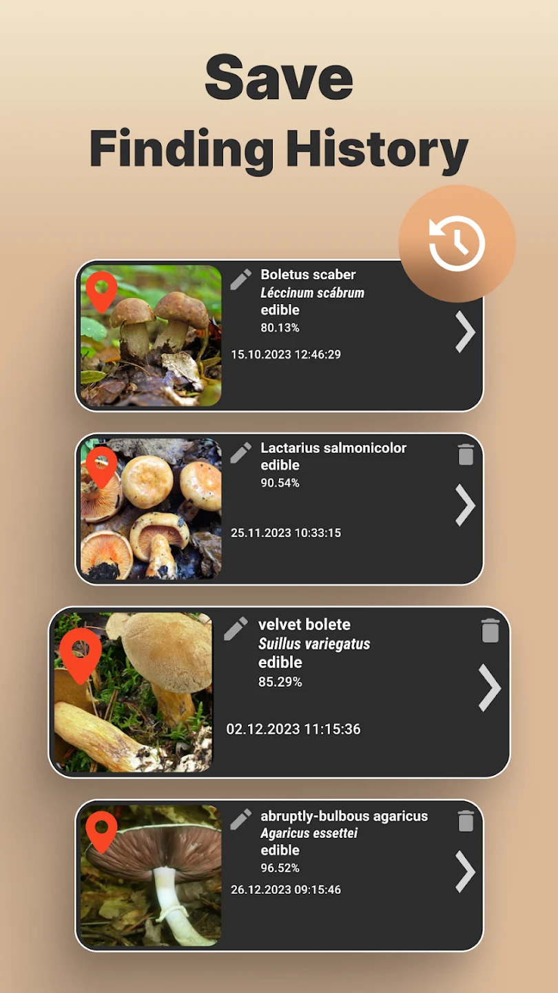 - Harvesting & Tracking Journal: Log your mushroom finds with species name, date, location (GPS), quantity, and condition. You can take photos directly within the app at the time of identification. The app maintains a personal database for your finds, allowing you to track your discoveries, note observations, and develop a personal inventory of encountered species.