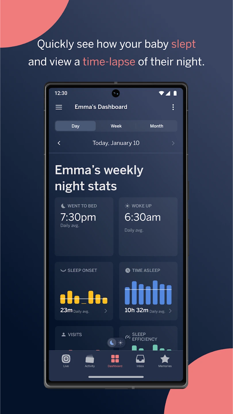 • Ambient Tracking: Continuously monitor the room’s temperature and humidity levels with precision; this helps maintain a comfortable and safe sleeping environment, automatically generating reports for parents to review during baby’s quiet moments for better overall sleep hygiene and well-being.