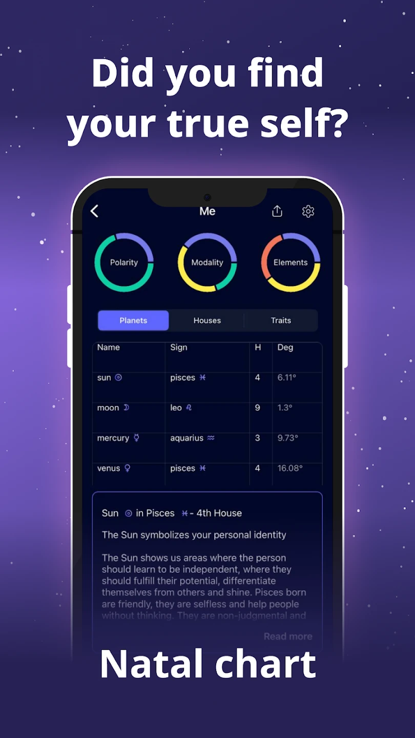 A: Absolutely. The app provides comprehensive horoscopes and chart analysis covering your Sun sign (core personality), Moon sign (emotional layer), Rising sign (impression you give), and planetary placements.