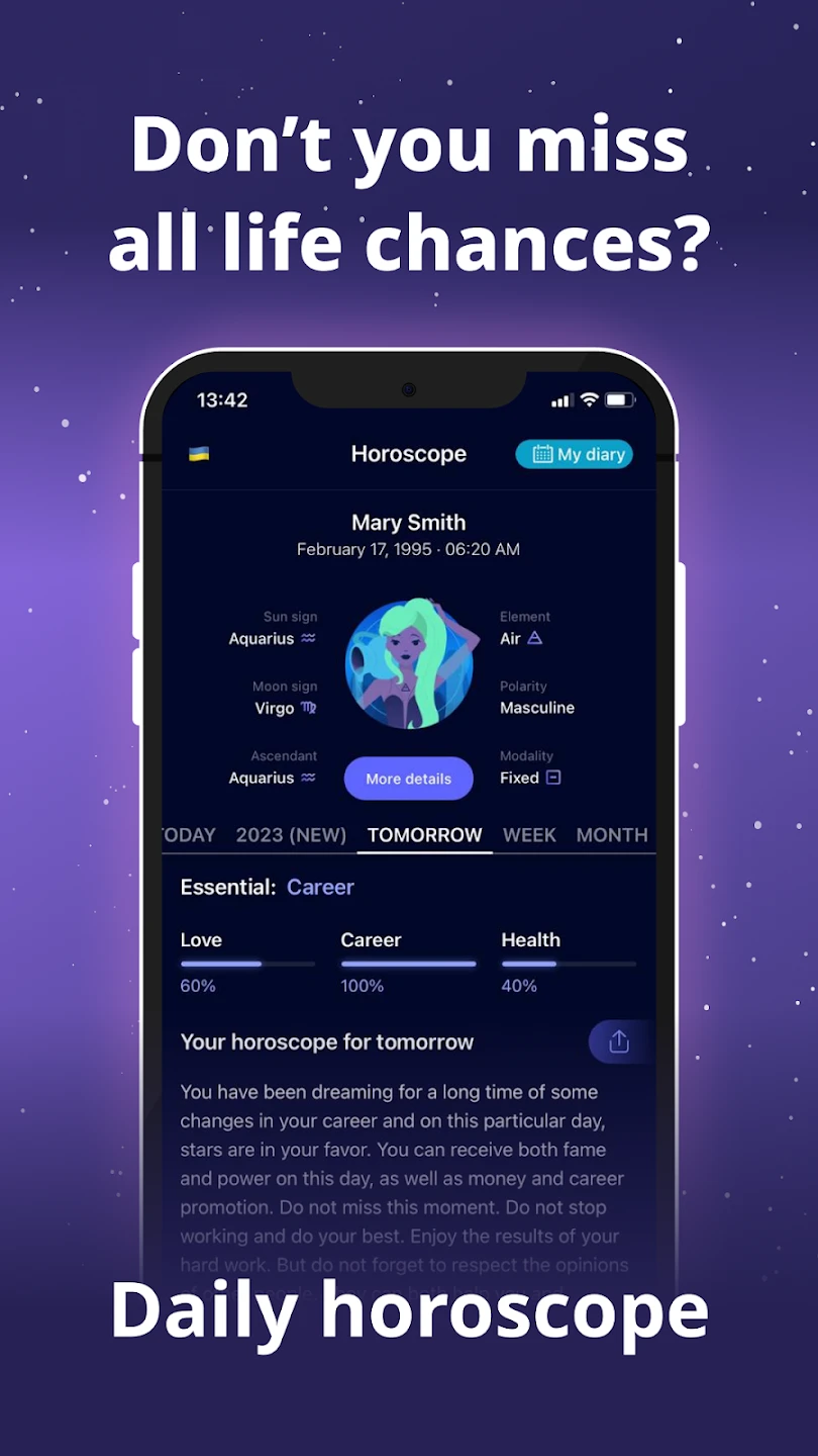 - Personalized Daily Horoscopes: Receive accurate and engaging interpretations of the day’s astrological influences specifically for your sun sign and rising sign. This feature saves you time by delivering insightful, tailored advice directly to your device, making navigating the day feel more connected and guided.