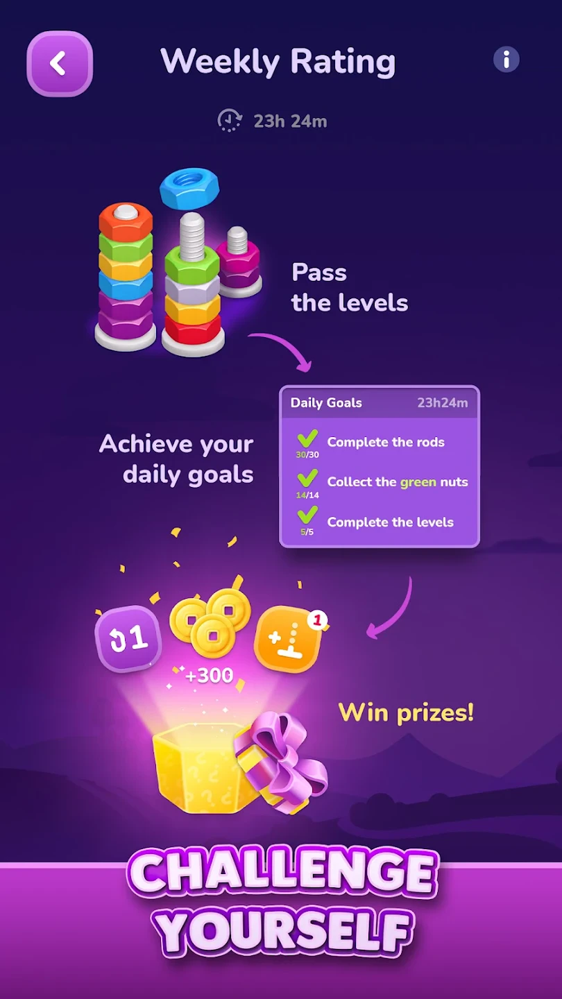 Offers shape and color sorting. Includes time pressure and combo bonuses familiar to fans of “Nut Sort: Color Sorting Game”. |