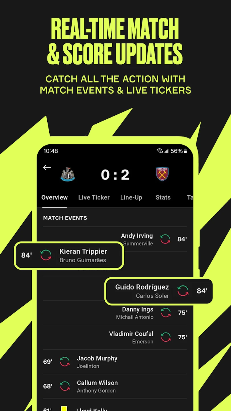- Live Match Updates & Push Notifications: Receive instant alerts for goals, red cards, and match updates directly to your device, ensuring you never miss a moment during live action without constantly checking the app.