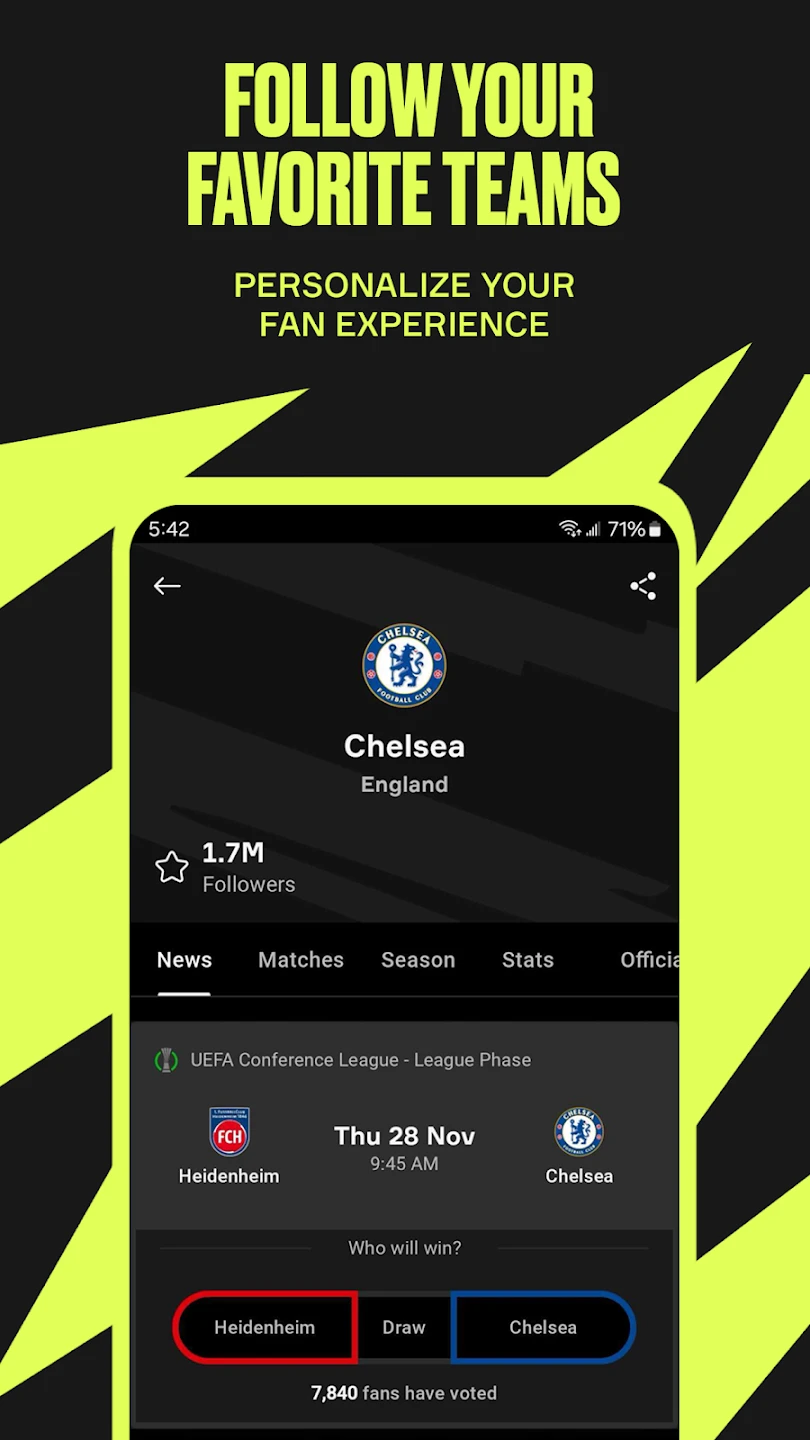 - Smart News & Matchday Alerts: Get personalized news recommendations based on your favorite teams, plus automated reminders for upcoming fixtures, helping busy fans stay informed efficiently.