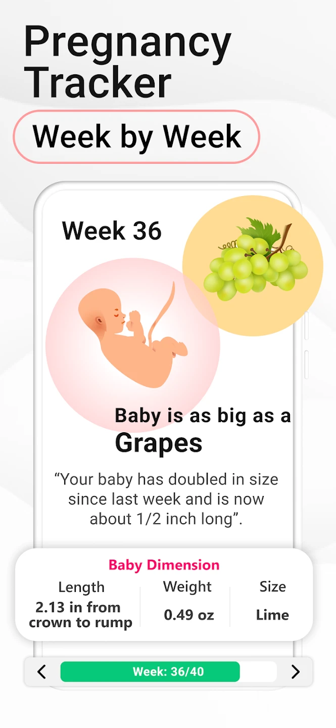 • Pregnancy Milestone Tracker: Automatically updates and visually represents all key developmental milestones for your baby at each week of gestation. The system integrates fetal growth metrics with trimester-specific events, helping users anticipate physical changes they’ll experience and crucial baby developments, from heartbeat detection to viability milestones, offering a comprehensive overview of both baby’s progress and the parent’s changing body.