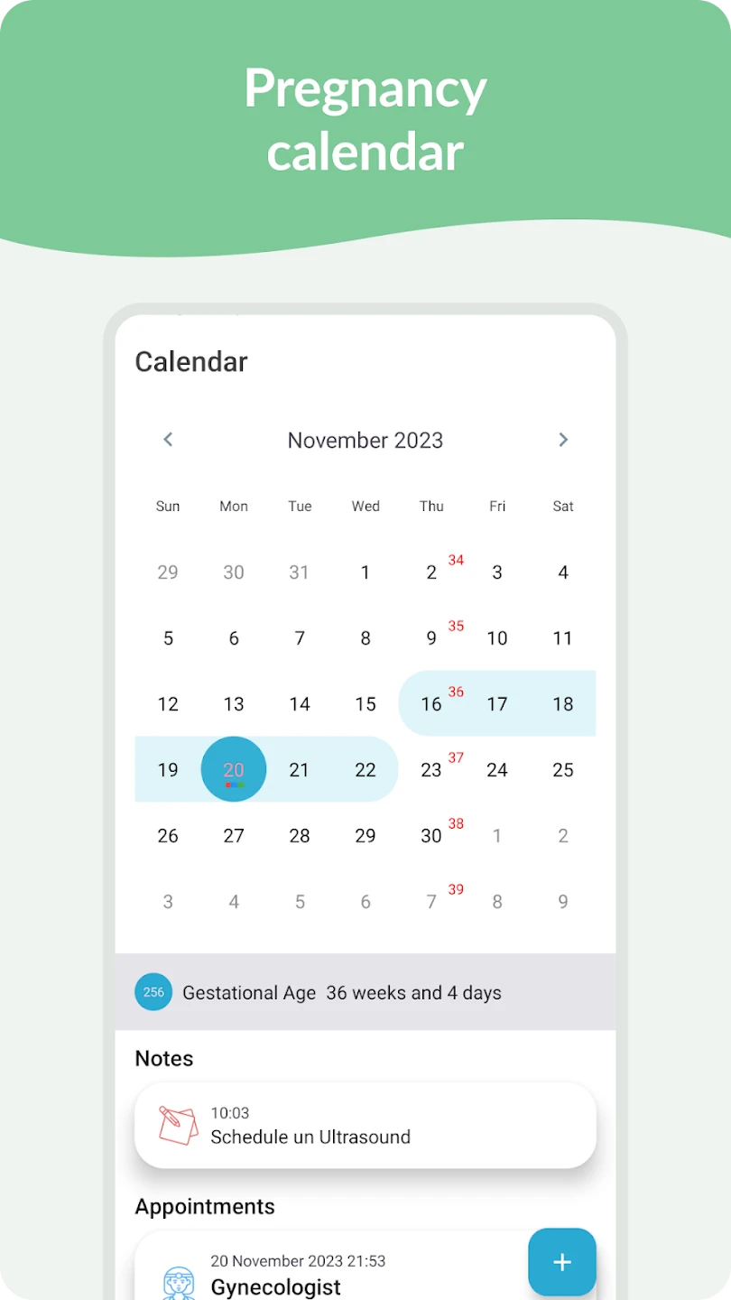 - Baby Appointment Reminders & Notes: Sets calendar alerts for prenatal visits, ultrasounds, maternity classes, and baby showers. Users can also store notes about each doctor’s visit or test results within the app, ensuring nothing important is missed and keeping medical history organized for quick access during appointments.