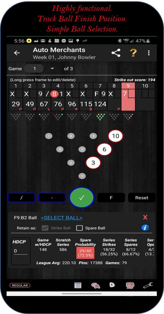 - Strike/Spare Analysis Tool: Automatically detects and validates strikes and spares with frame-by-frame verification, helping players and organizers identify scoring errors quickly. Used when reviewing games, this unique feature highlights key scoring anomalies that could affect tournament standings, especially valuable for experienced bowlers analyzing their technique.