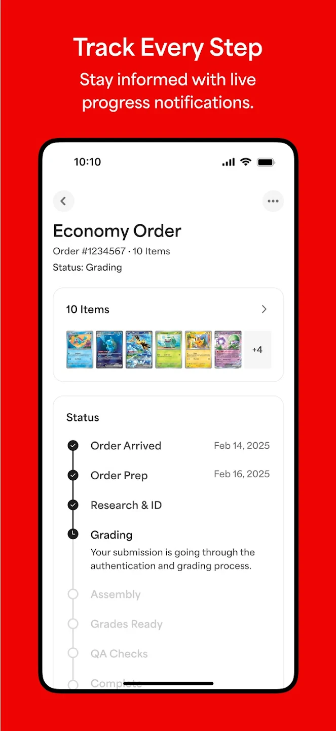 - Grading Status Dashboard: Access detailed tracking information through an intuitive interface showing current stage (e.g., received, photographed, graded), estimated timeline, and past grading history. The dashboard utilizes color-coding and milestone indicators to provide clear visibility into the process, enhancing transparency for users managing multiple submissions.