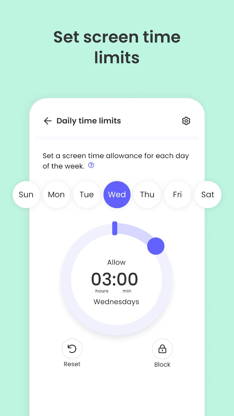 - Screen Time Management: Users can set specific limits for device usage, both daily totals and restrictions for particular days (like weekends or nights). This feature helps solve the common problem of unstructured screen time by enforcing breaks, improving focus on homework, hobbies, and face-to-face interactions, and promoting a healthier relationship with technology.