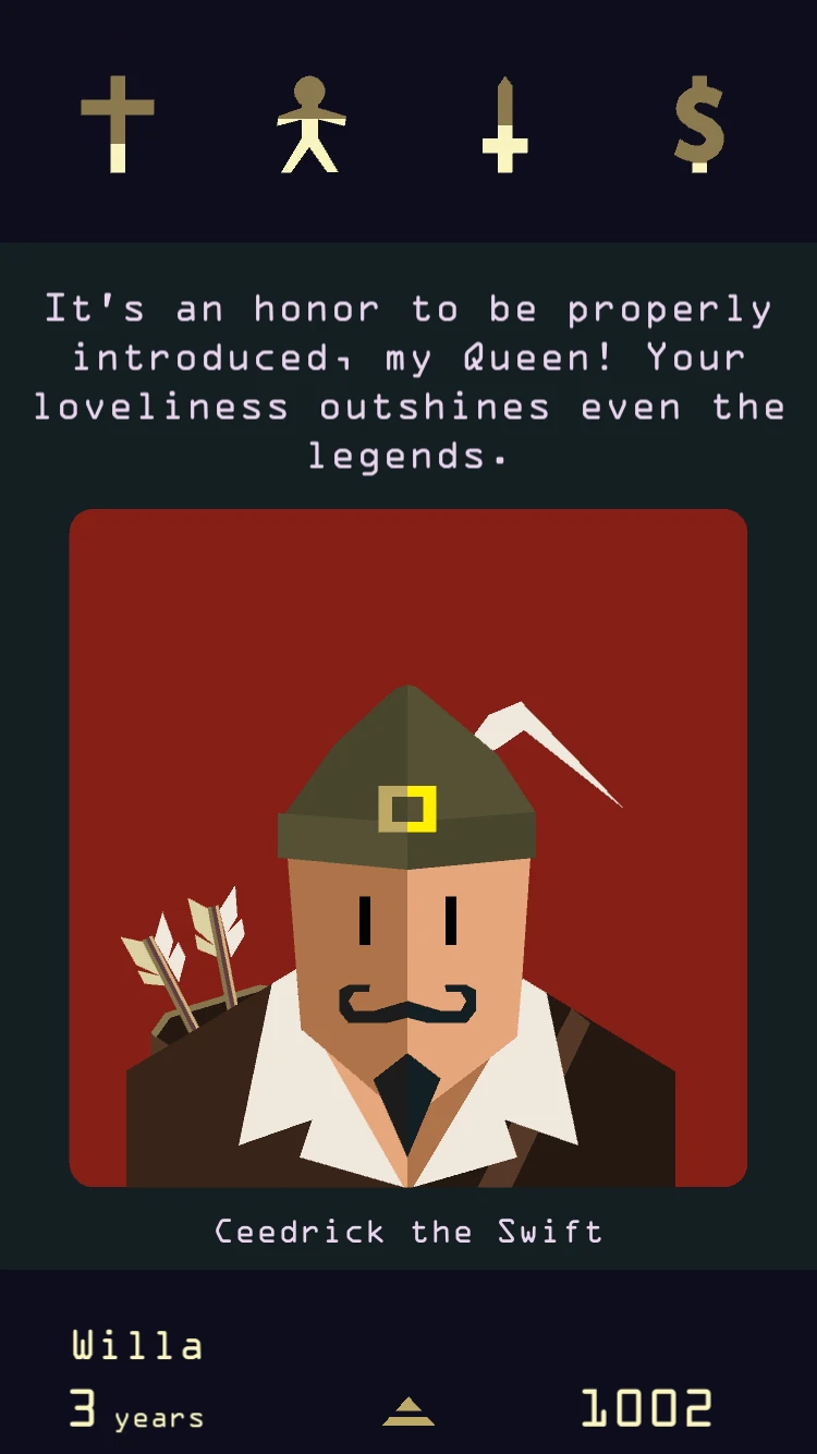 - [Core Gameplay Loop]: The main loop involves swiping cards to interact with courtiers (characters), choosing actions like proposing laws, forming alliances, or asking questions. Players must manage resources, maintain popularity, and survive the treacheries of the court, with the game ending upon the king’s death, potentially forcing a new succession. The objective is to survive and make decisions that keep you in power.
