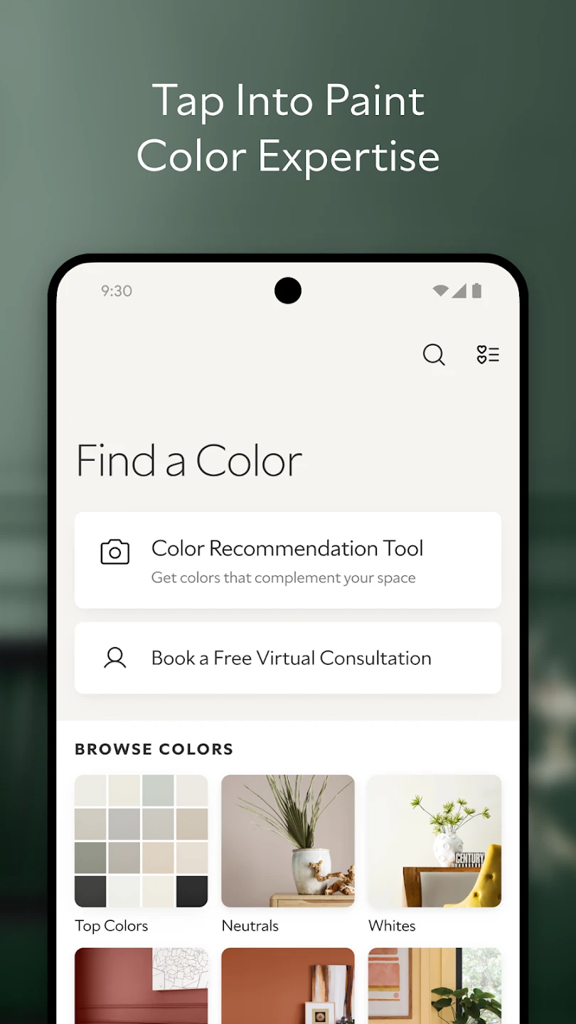 A: Yes, absolutely! You can filter and browse colors by mood (calm, energetic), style (modern, traditional), or room type (bathroom, kitchen, living room) within the app. This helps you quickly find Sherwin-Williams Color Expert™ colors perfectly suited to the specific ambiance and function you are trying to achieve.