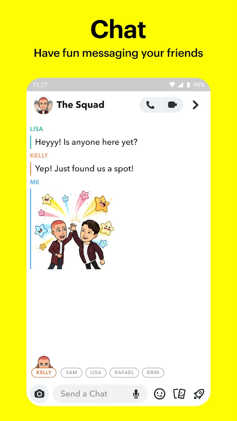 • Group Chat & Bitmoji: Organize conversations with multiple people and personalize avatars for private messaging. This feature streamlines communication for friend groups, allowing members to express themselves visually even when not video calling, while keeping text conversations distinct from media sharing.