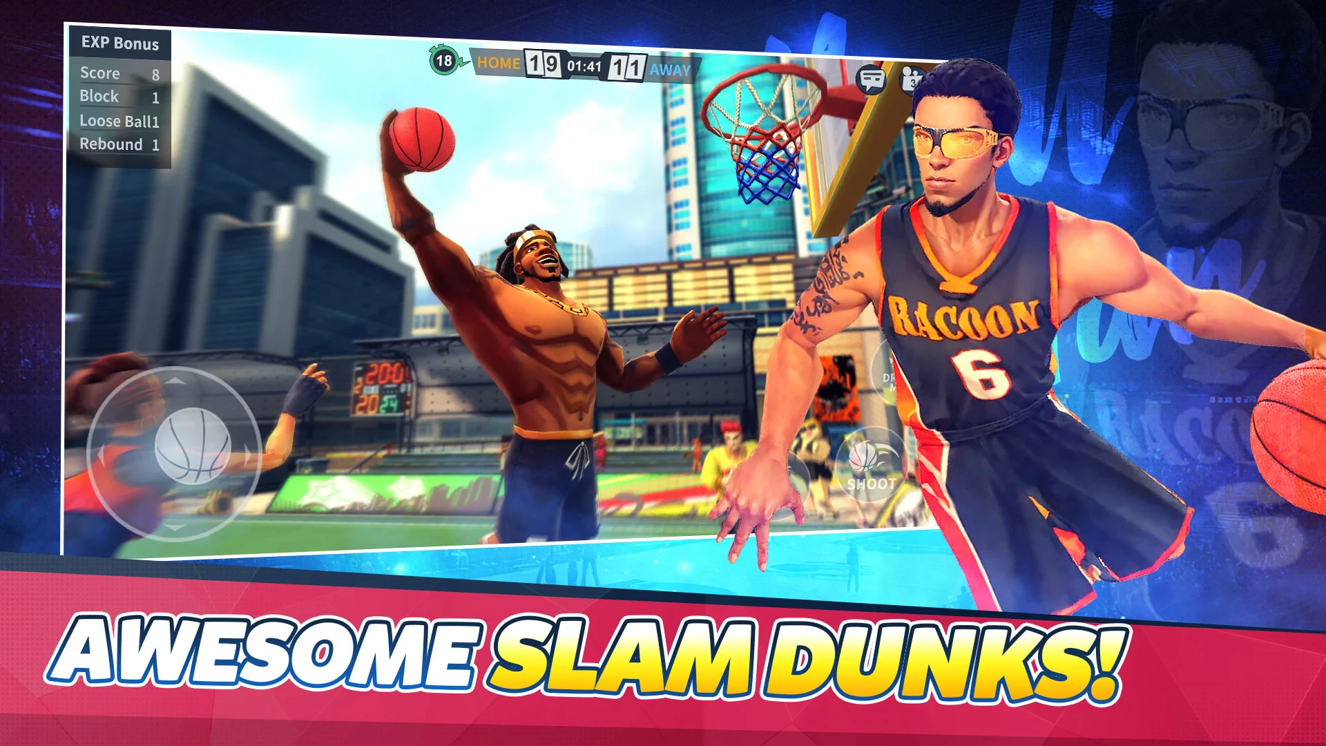 - [Visuals or Art Style]: The game features vibrant, stylized graphics with neon court markings, exaggerated player movements, and particle effects for dunks and 3-pointers. Dynamic lighting creates an energetic atmosphere, with courts featuring unique designs based on different city environments.