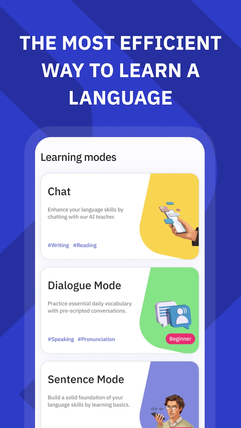 - Vocabulary Building Through Context: New words appear naturally during conversations and are reinforced through example sentences, quizzes, and visual associations. Users can track progress with interactive flashcards and see how vocabulary appears in authentic usage situations.