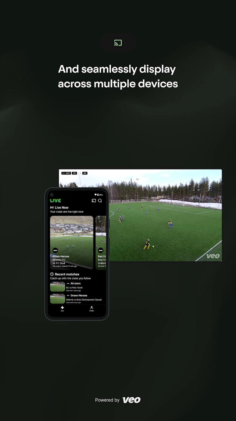 - Multi-Platform Broadcasting: Broadcast directly from Veo Live to major platforms like YouTube, Facebook, Instagram, TikTok, or Twitch without complex integrations. This eliminates the need for switching apps or manually uploading recordings, providing immediate audience engagement during live events.