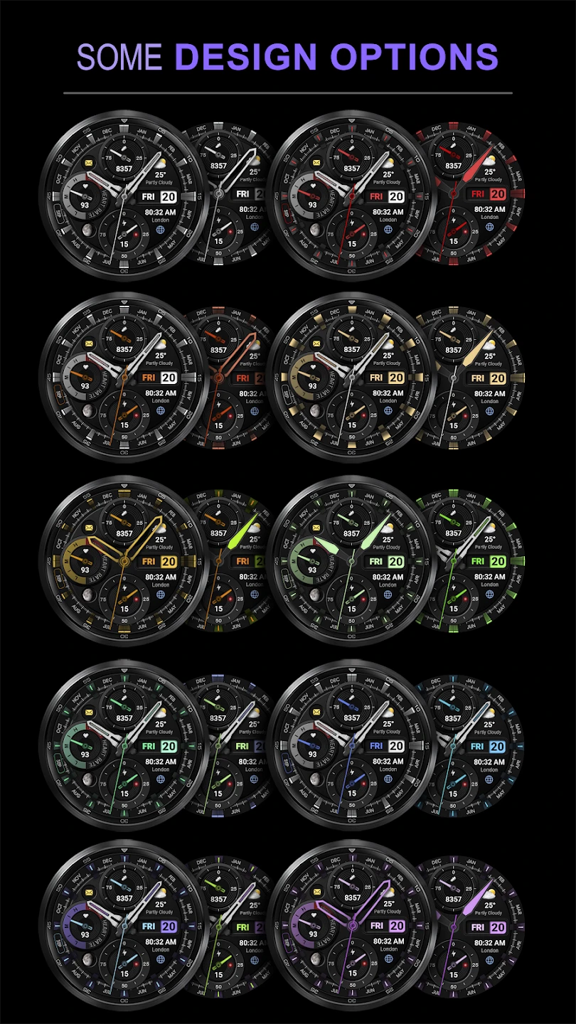 - Multiple Display Styles & Templates: Users can choose from a variety of base templates (e.g., analog, digital, minimalist, sporty) and apply complex animations, gradients, and transitions between them or individual complications. This enhances the user experience by allowing personalization beyond simple colors, enabling users to express their individual style and adapt the watch face to different occasions or activities, making the smartwatch feel truly their own.